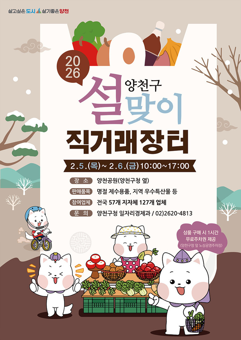 ‘2026년 양천구 설맞이 직거래장터’는 오는 2월 5일(목)과 6일(금) 양일간 오전 10시부터 오후 5시까지 양천공원에서 열린다. 행사와 관련한 자세한 사항은 양천구청 일자리경제과로 문의하면 된다.