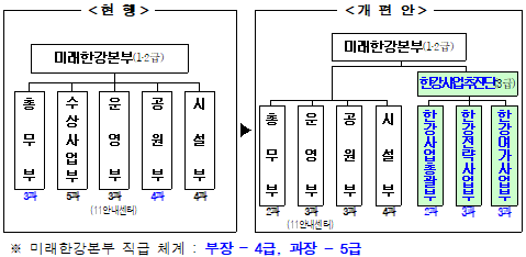 그레이트 한강 프로젝트를 추진하기 위해 옛 ‘한강사업본부’를 ‘미래한강본부’로 이름을 바꾸고, 기존 한강사업본부 외에도 서울시 각 부서와 자치구에서 총 68명(정원 기준)의 공무원을 차출해 3급 조직인 ‘한강사업추진단’을 신설하기도 했다.