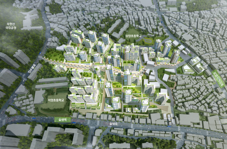 삼양사거리역(지구 중심), 솔샘역 더블 역세권에 위치한 대상지는 주변에 미아뉴타운, 벽산아파트 등 25층 내외의 고층 아파트들이 입지해 있음에도 불구하고, 20m(완화시 28m) 고도제한에 묶여있어 개발이 어려웠던 지역이다.