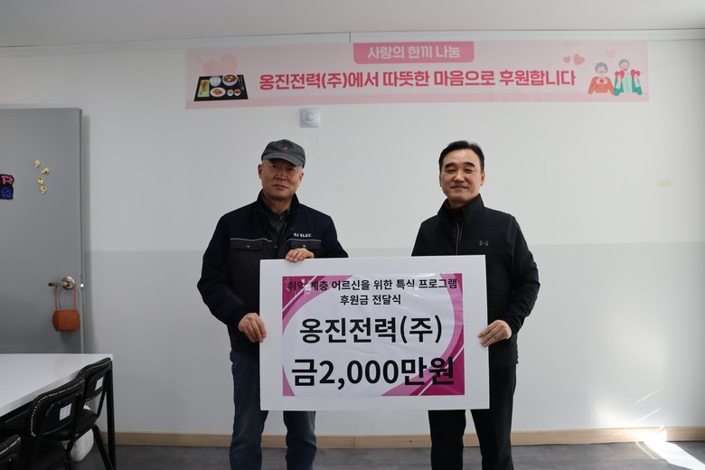 오순길 옹진전력㈜ 대표는 “지역사회와 상생하는 기업의 책임을 다하고자 이번 후원을 결심했다”며, “생활에 어려움을 겪는 어르신들의 일상에 저희가 준비한 따뜻한 밥 한 끼가 작은 위로와 힘이 되었으면 좋겠다”고 전했다.